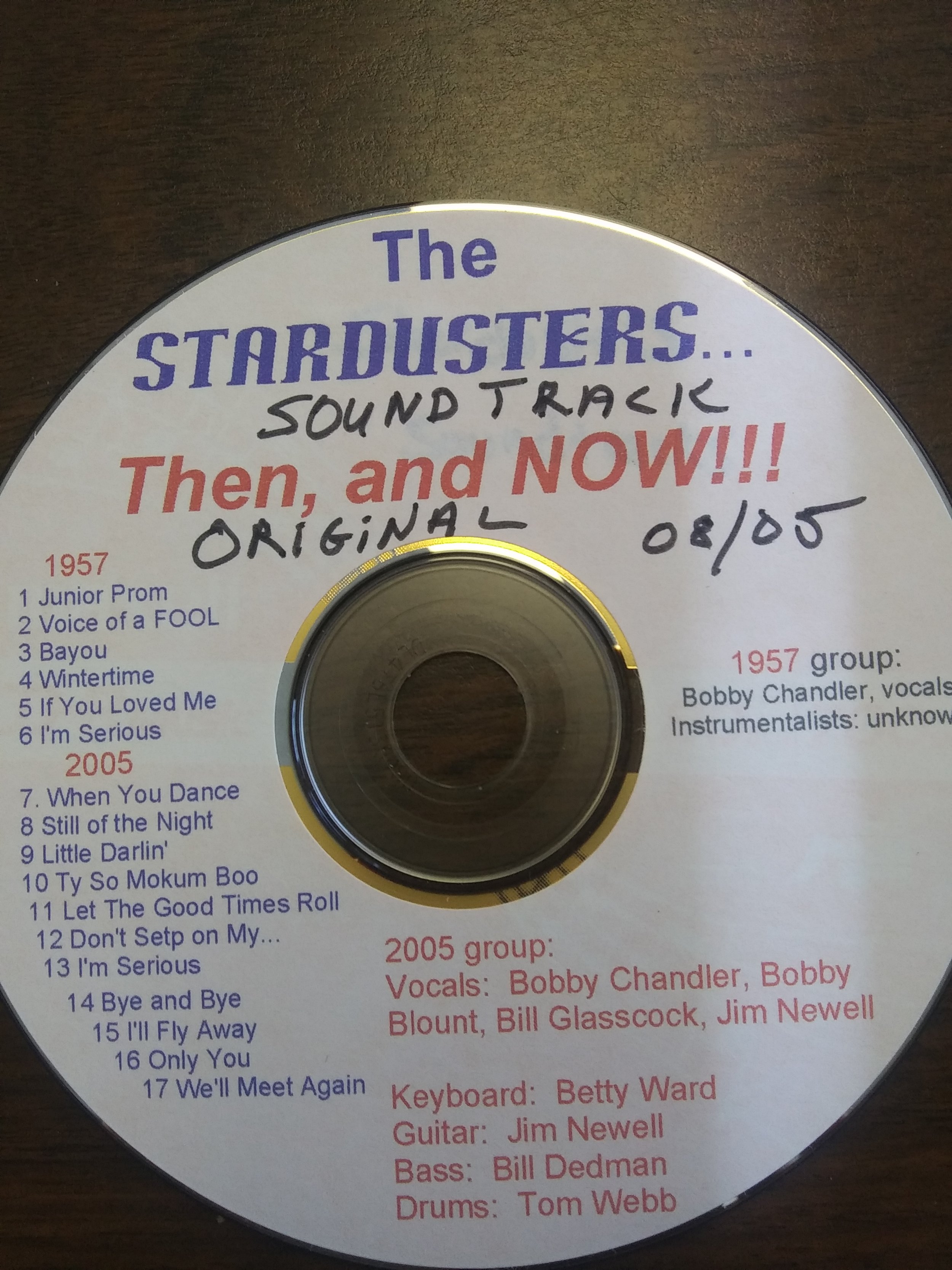 The best was a CD of THE STARDUSTERS - THEN AND NOW!!! with some songs actually recorded in 1957 and then ones recorded in 2005. What a find!!! When you listen to this CD, you'll find yourself singing along with several of the songs (especially the religious ones), laughing at Glasscock as he booms in with his bass voice to make sure you know it's him and then tearing up when you hear Bobby singing "Only You" again.