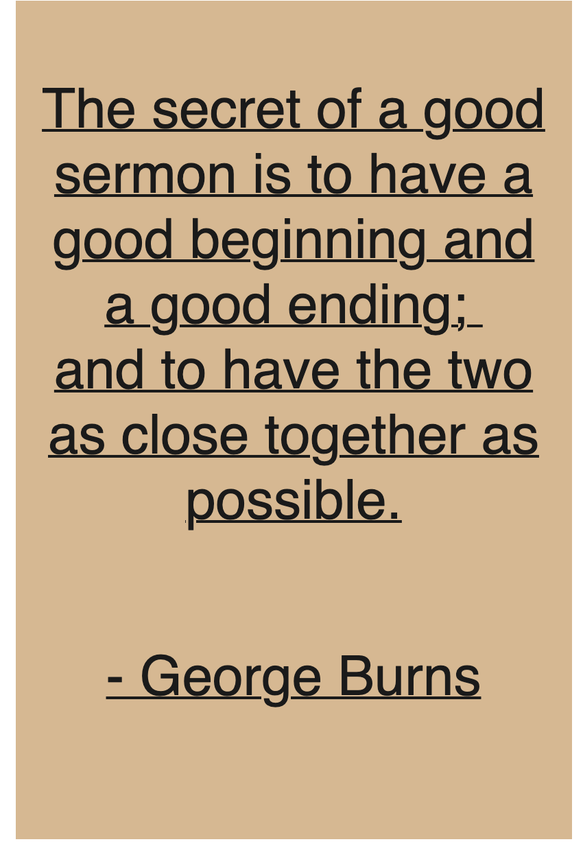The secret of a good sermon is to have a good beginning and a good ending;